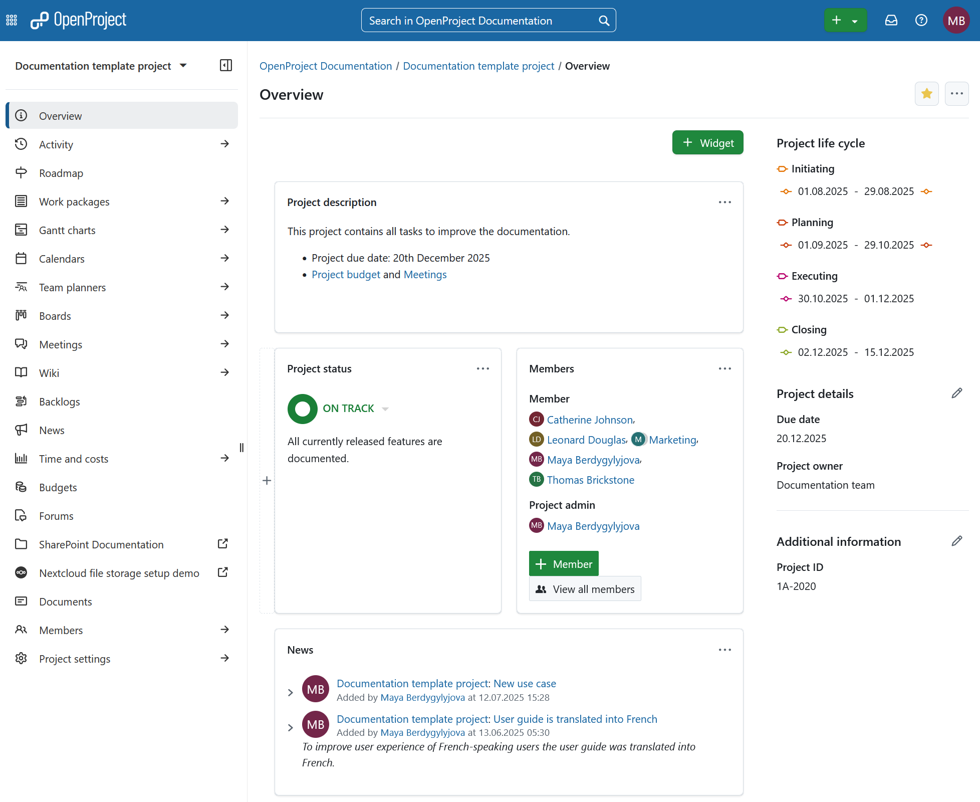 Display all important information of a selected project in a single dashboard, for example project description, project status, project members, news, spent time, and progress on work packages.