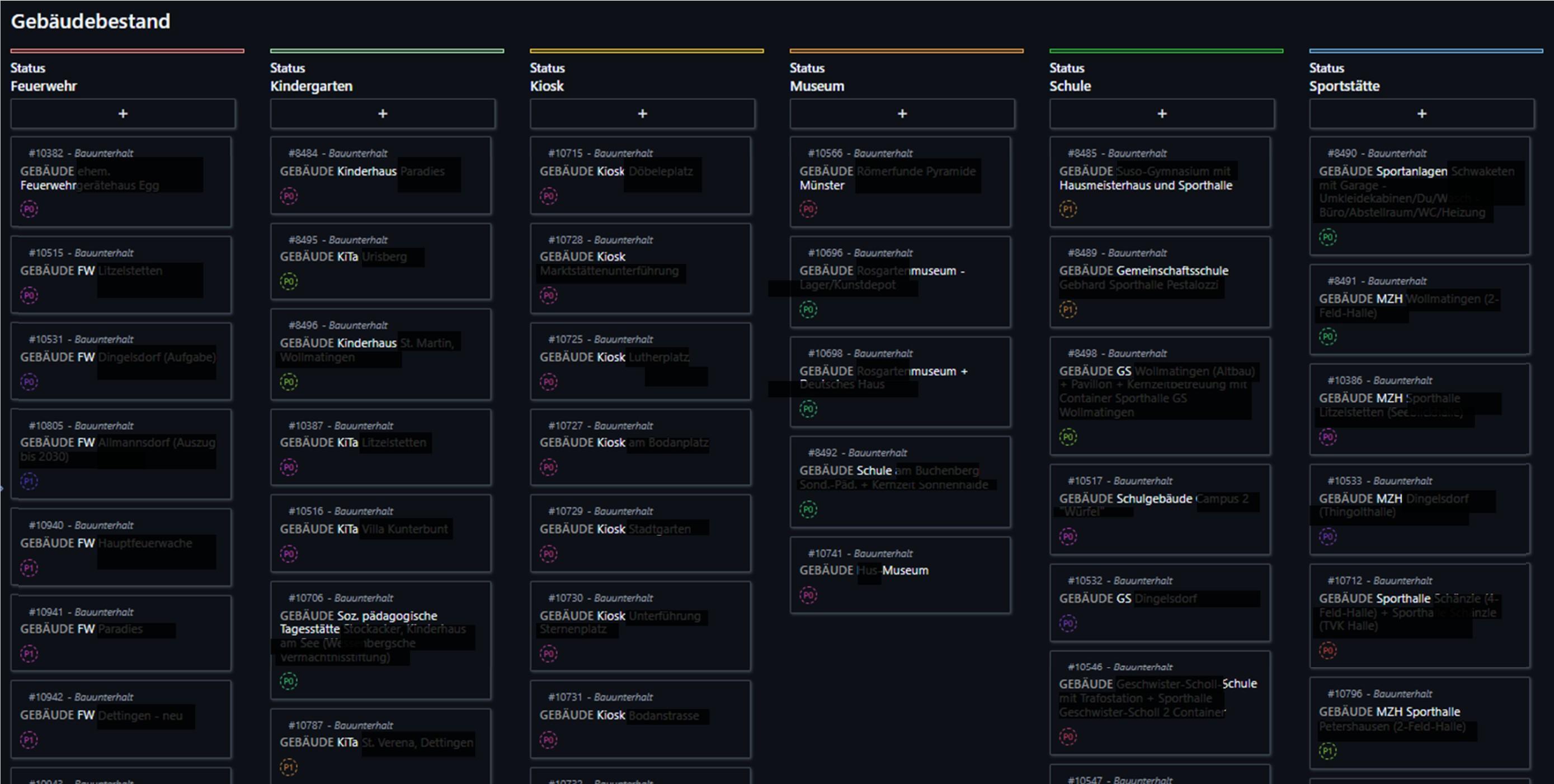 The maintenance and repair of municipal buildings in Constance is now also fully mapped in OpenProject. The 16-people team uses Kanban boards and work breakdown structures to manage the maintenance of more than 160 buildings. Each building is mapped in OpenProject using work package types, subdivided by building category. Each task for these buildings - from repairs to regular inspections - is created directly in the system as an associated subtask and assigned to the responsible team members for processing.