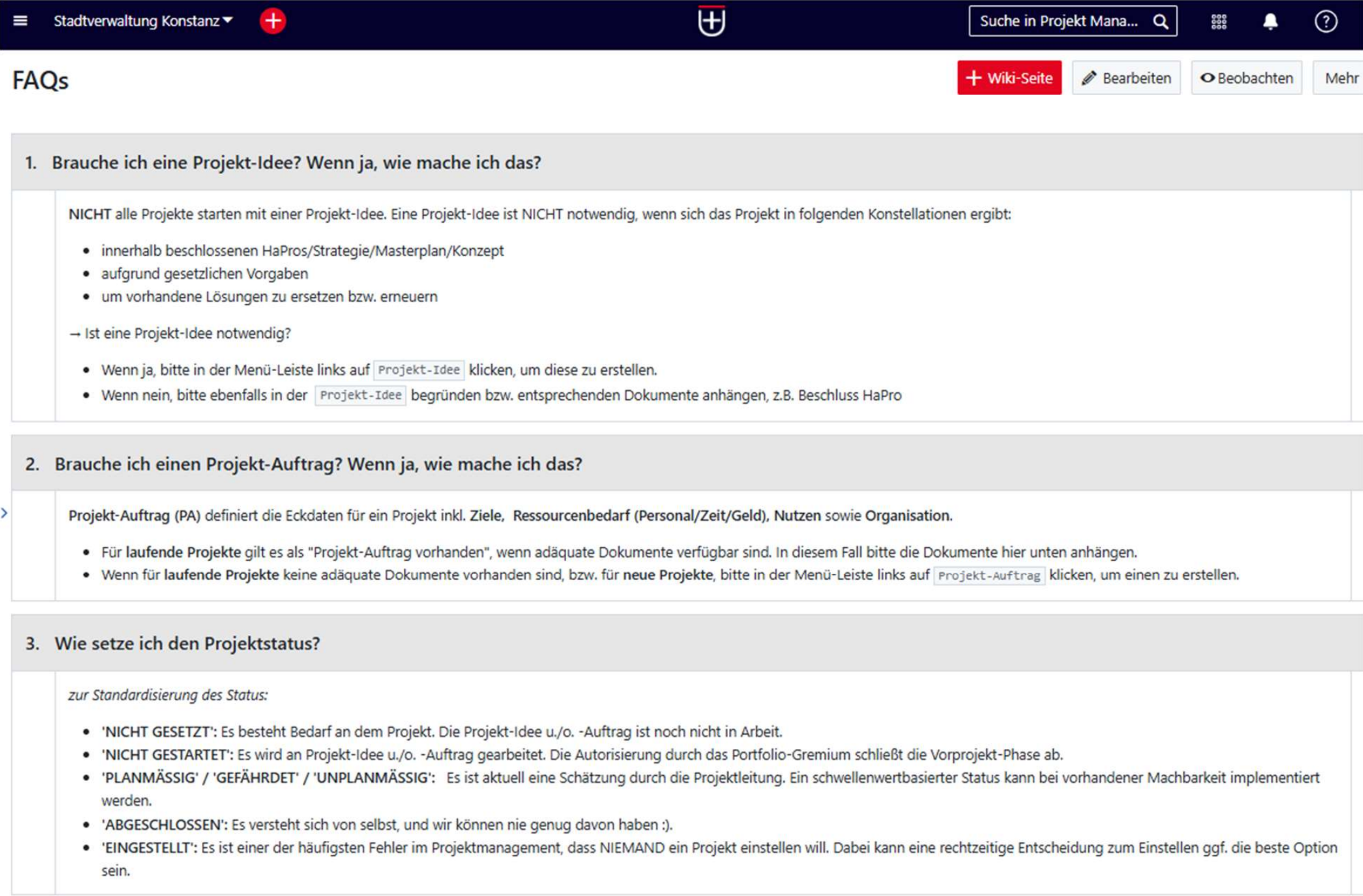 Project management FAQs are collected and shared in a Wiki.