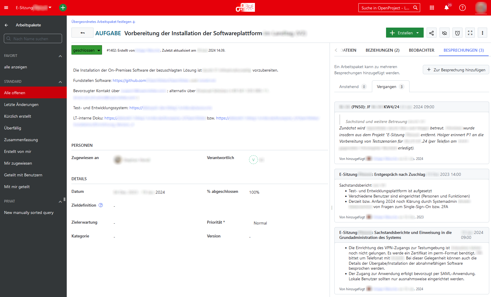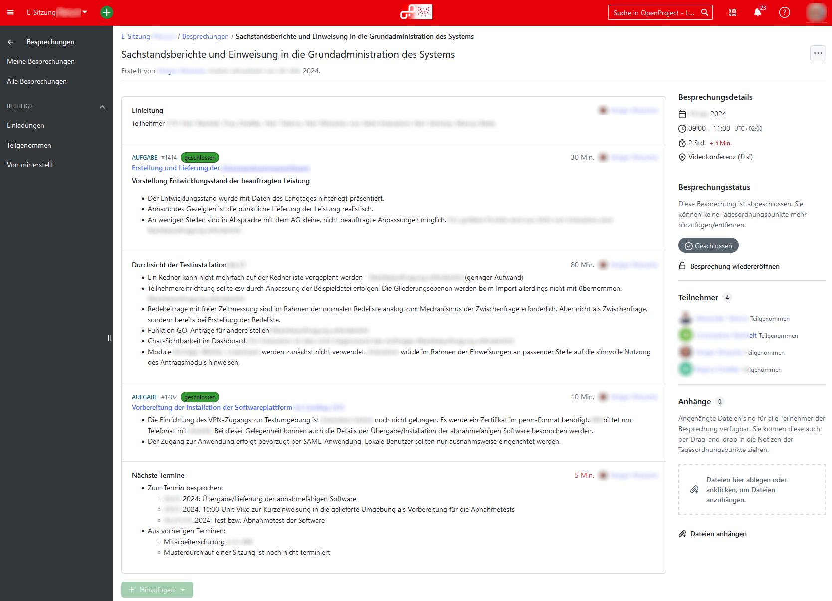 In the Meetings module, meeting items are planned, linked to work packages, and results are documented.