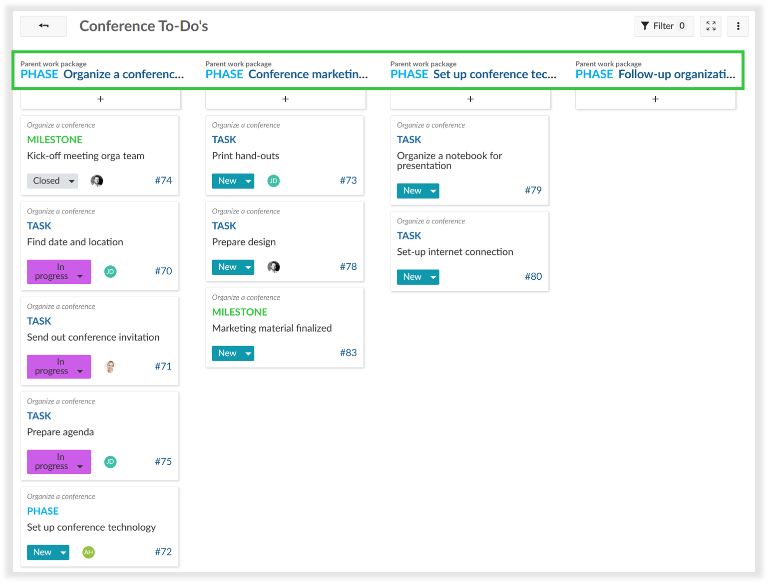 The new board types in OpenProject allow you even more flexible agile project management. Now, you can create a work breakdown structure for your project by adding parent-child-elements as a board. Select the parent work packages from the list and create a board with all corresponding children work packages.