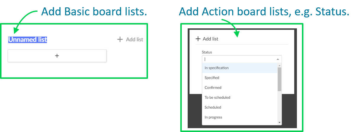 Basic board lists: you can create any kind of list and name them to your needs. Remember: no updates to the attributes will happen when moving cards between the lists.