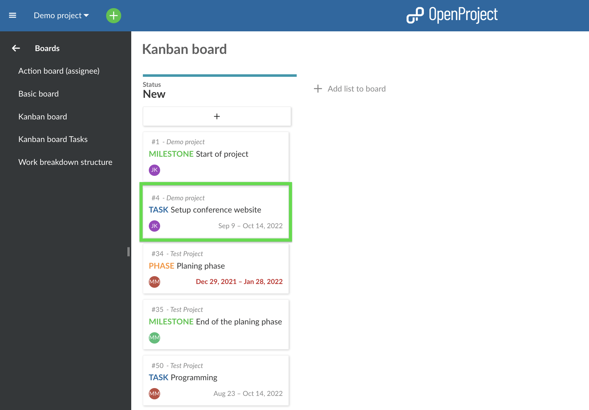 In an Action board each list represents a value of an attribute of the contained work packages (cards). For example the Status board includes a list for the status “New” and a list for the status “In Progress”. Moving work packages (cards) between two lists will update them automatically, based on the list to which they’re moved. After adding lists to your board they will automatically be filled with the respective work packages.